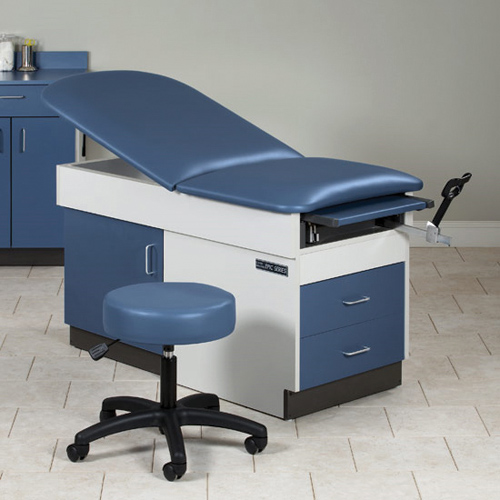 Plush vinyl upholstery over 2″ firm padding * Full 27″ width for patient comfort * Air-spring adjustable backrest * Coated, two position adjustable stirrups * Padded, pull-out leg rest on steel track * Easy care all laminate base * Color coordinated doors and top available * Chip resistant edges * 1 large side storage compartment with shelf * Storage compartment is accessible from both sides (no right or left handed tables) * 2 Euro style drawers with all steel slides * 400 lbs. load capacity under normal use * Built with plywood and laminate panels that are California CARB I compliant * Top sections are easily replaceable in the field * Adjustable feet for leveling