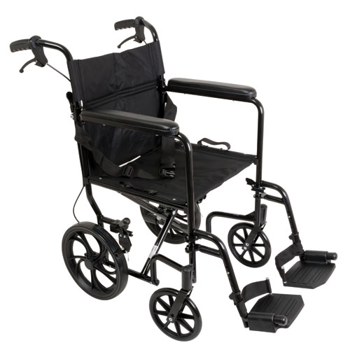 ProBasics Aluminum Transport Chair with 12-Inch Wheels, 300 lb Weight Capacity. The ProBasics Lightweight Aluminum Transport Chair with 12″ rear wheels has a lightweight aluminum frame and padded upholstery. 300 lb weight capacity. Sold as each. The ProBasics Lightweight Aluminum Transport Chair with 12″ rear wheels has a lightweight aluminum frame and padded upholstery. The flared handles and handy back-release hinge allow the back to fold down for easy storage and transport. The companion activated hand brakes are ideal for locking the rear wheels during patient transfers, and provide for added safety and control. Comes complete with seat belt, swingaway footrests with composite footplates and heel loops. Supports patient weights up to 300 lb. Lightweight aluminum construction (only 20 lb) 12″ rear wheels for better performance on uneven surfaces Companion activated hand brakes are ideal for locking the rear wheels during transfers Flared handles and handy back-release hinge allow the back to fold down flat and compact for easy storage and transport Powder coated aluminum frame is lightweight and durable Padded full-length permanent armrests Padded nylon upholstery is comfortable, lightweight and easy to clean Seat belt for added safety Nylon seat straps allow for ease of folding and lifting Composite wheels with solid rubber tires are lightweight and maintenance-free Tool-free, swing-away composite footrests with heel loops included HCPCS Code: E1038*